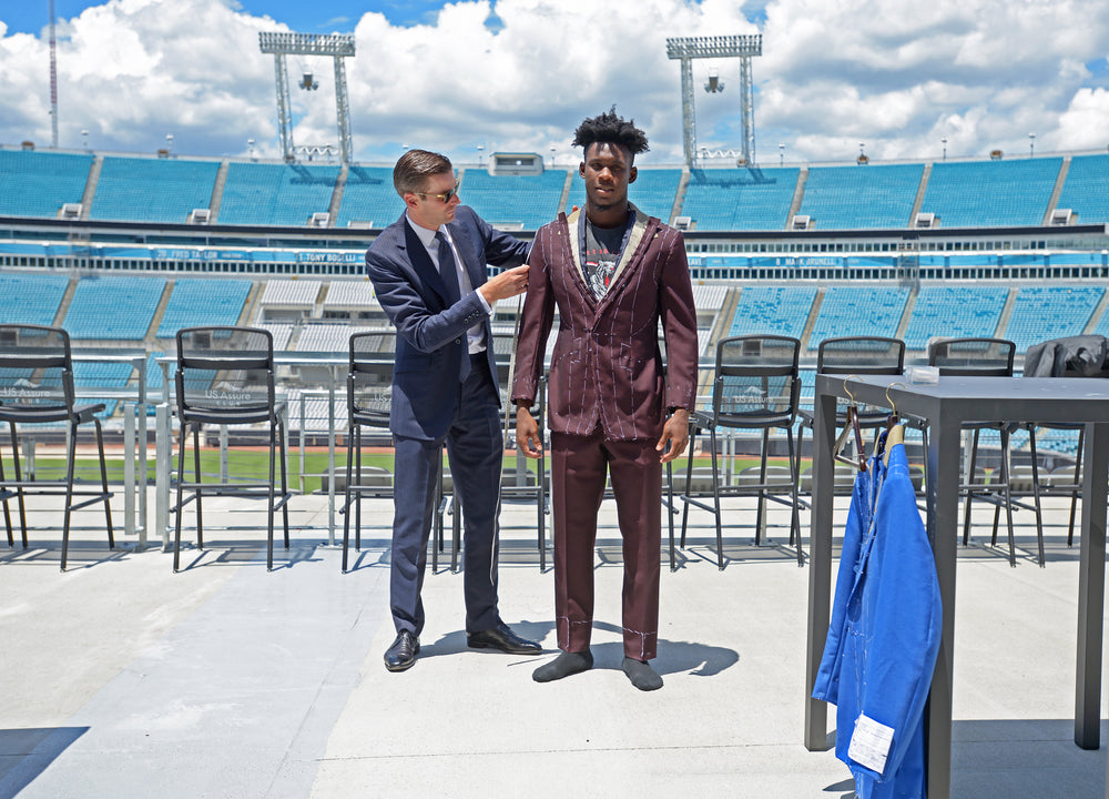 The worlds of bespoke tailoring and American Football have a serendipitous meeting when Huntsman’s creative director Campbell Carey fits Jacksonville Jaguars star players Allen Hurns and Allen Robinson in celebration of the NFL coming to London!