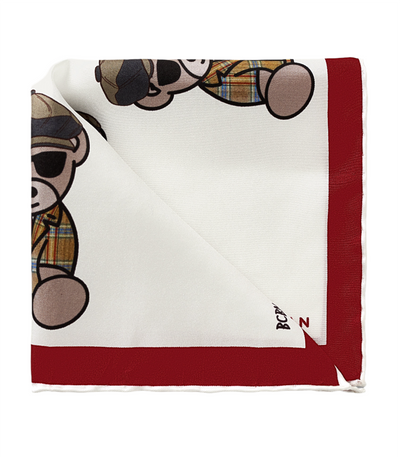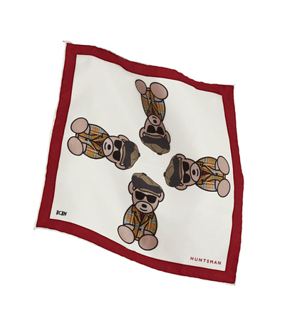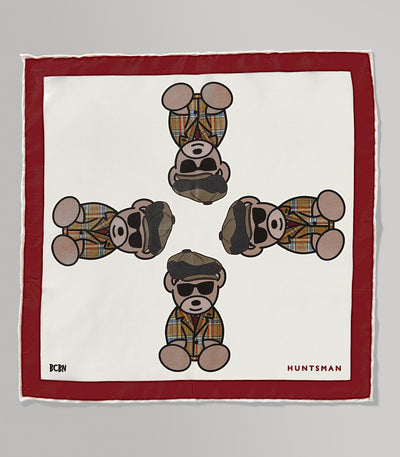 Designed in support of the "Be Cool Be Nice" campaign, this silk-twill pocket square features the iconic BCBN bear in four signature Huntsman styles, finished with a claret border.