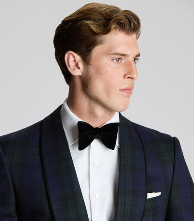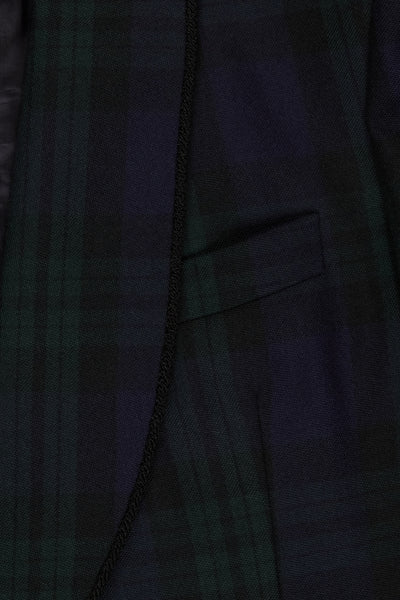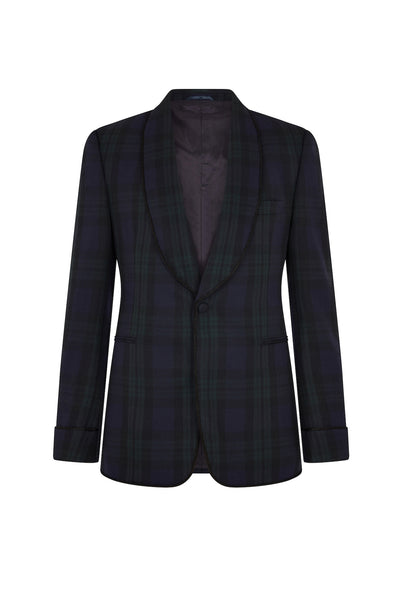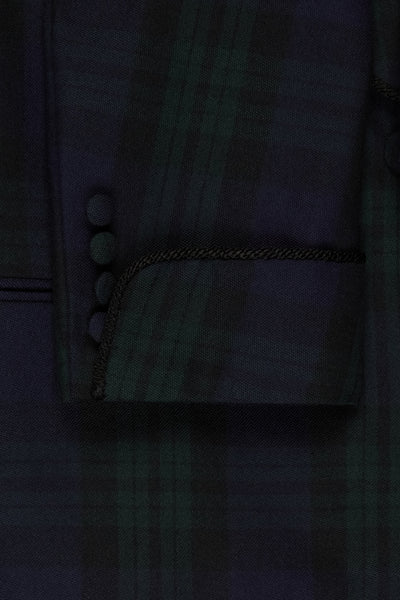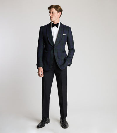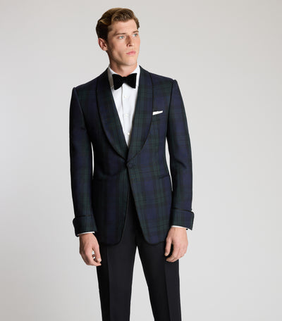 For unimpeachably elegant evening wear this Black Watch Tartan dinner jacket is a perfect balance of statement design and subtle style nuances. With a generous shawl lapel, finished with delicate silk braiding, it’s the attention to detail that sets it apart from other evening wear. Cut in our signature one-button style to create a chic, contemporary silhouette; pair this jacket with our midnight blue barathea silk braided dress trousers to complete your ensemble.