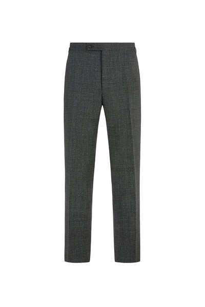 Cut in Huntsman’s signature single-breasted silhouette with a one-button closure, the jacket features a notch lapel, slanted flap pockets, and side vents for comfort and style. Paired with flat-front trousers finished with side adjusters and a curved zip, button and bearer fly, this suit is fully canvased to ensure impeccable structure and long-lasting wear.