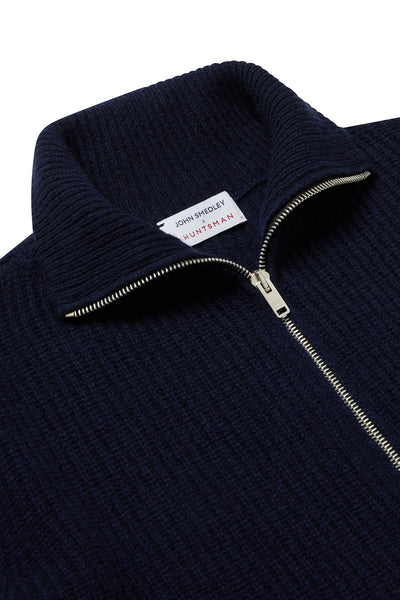 Discover the exquisite warmth and softness of the finest knitwear, born from the collaboration between Huntsman and John Smedley. Crafted in a luxurious 7-gauge ribbed merino and cashmere blend, this refined jumper features a full double zip front and a stand-and-fall collar, an elegant and versatile addition to any wardrobe.