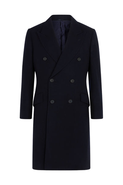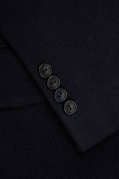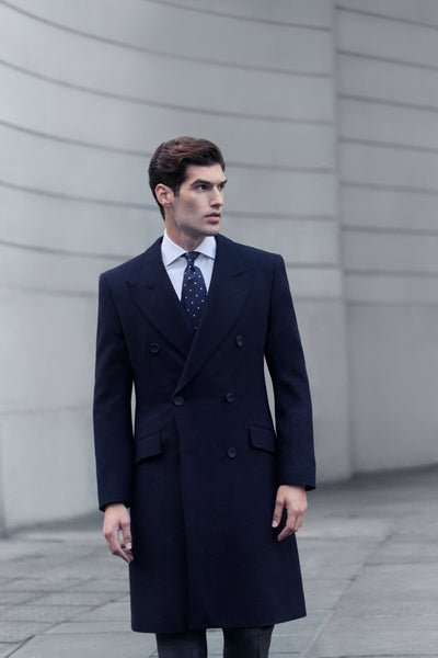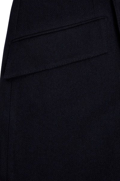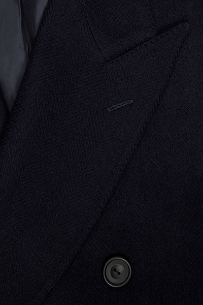 Tailored in a classic double-breasted silhouette, this navy herringbone overcoat is crafted from a luxurious blend of 90% Merino wool and 10% cashmere, delivering warmth, softness, and a beautifully structured drape. The rich herringbone weave adds texture and visual depth, making this coat a statement of understated authority.