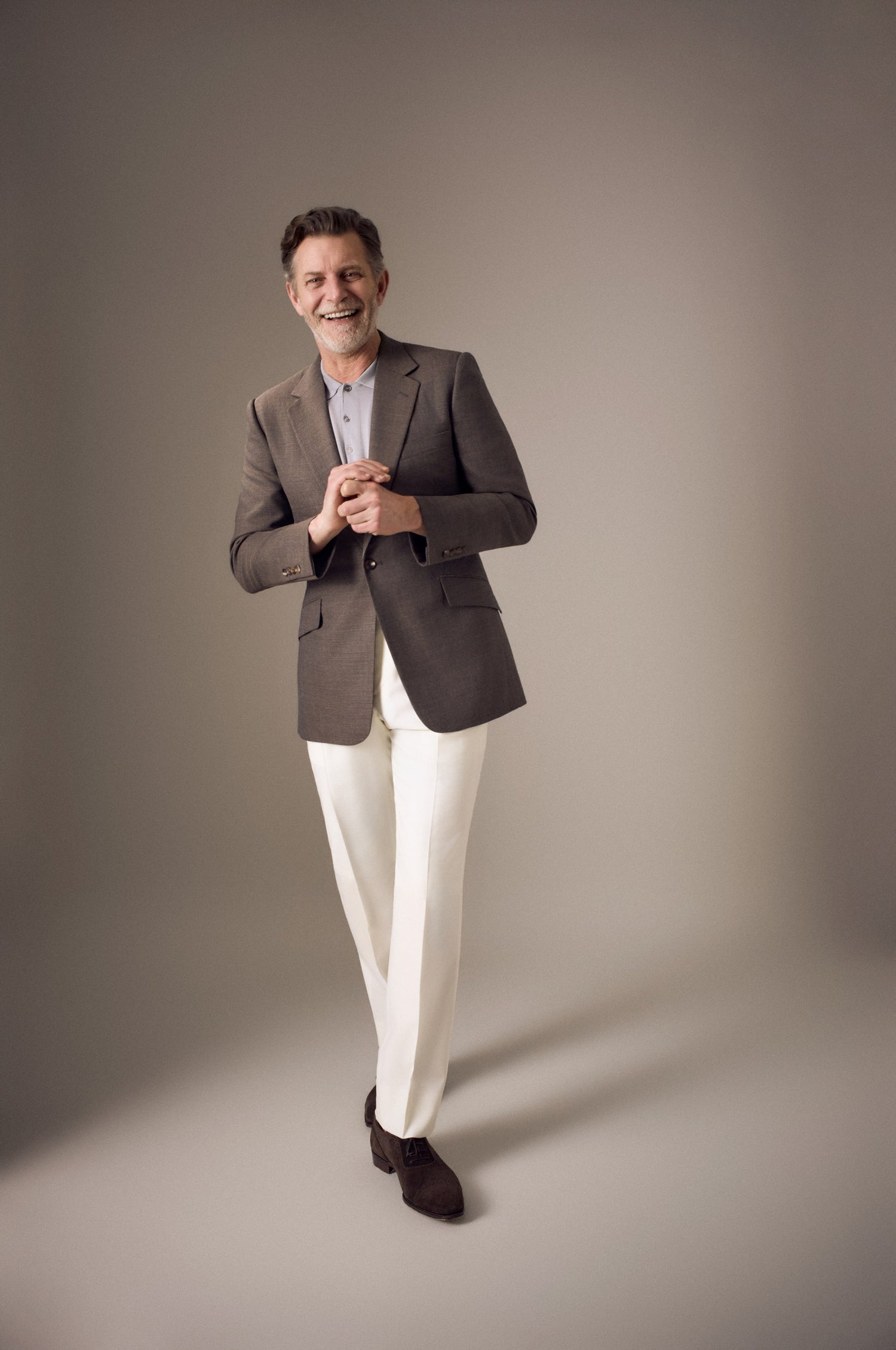 The tone sits between chocolate and warm espresso, offering a softer alternative to navy while maintaining equal versatility. Paired with ivory trousers and a fine gauge knit, the jacket demonstrates its ability to move seamlessly between tailored formality and relaxed refinement.