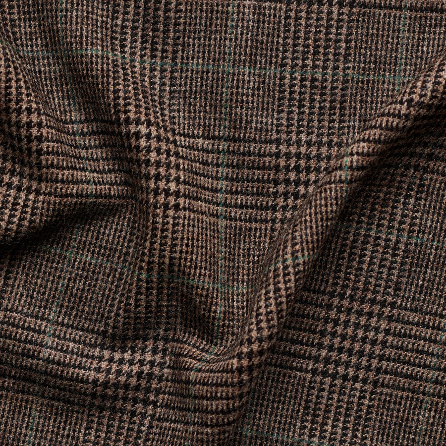 This particular cloth has an open weave, designed to breathe, as well as a 17–18oz weight, giving it excellent structure to hold its shape. The base colour of brown and black, with an overcheck in emerald green, gives it a very versatile look. Whether you are looking to have a three-piece suit made or just a sports coat, this cloth is exceptionally easy to wear.