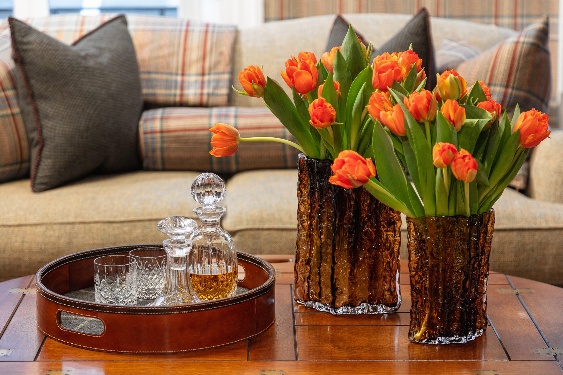 Step into the club, and you’ll be greeted by our beautiful dark mahogany champagne & whisky bar, a splendid replica of an inviting East London pub, but with the savoir-faire of a traditional club. The rich, warm tones of the wood compliment our impressive double-height walls, papered in the iconic Huntsman Tweed, and classic French doors open to reveal a unique perspective on Savile Row.