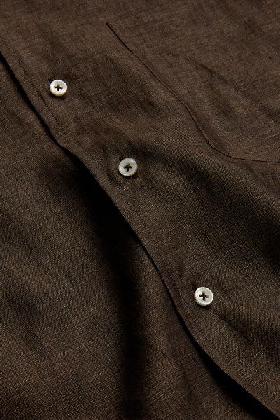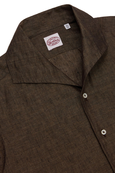 Cut from a lightweight brown cloth with a soft, breathable handle, this Riviera collar shirt offers relaxed elegance rooted in considered proportion. The warm chocolate tone brings depth and richness, pairing effortlessly with mid-blue tailoring, cream trousers or tonal neutrals.