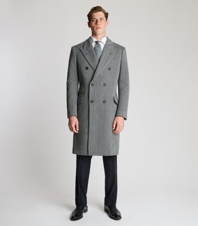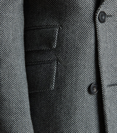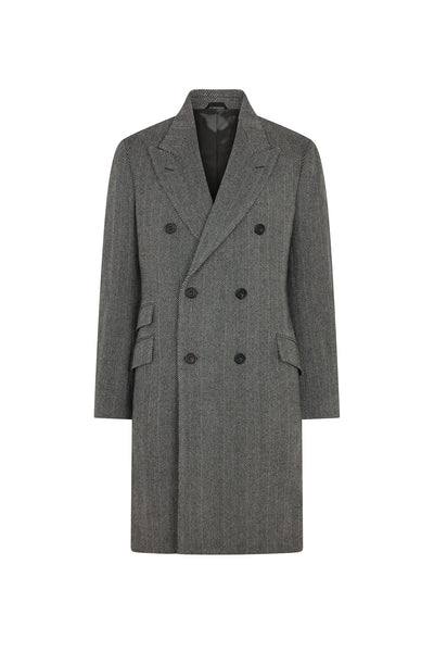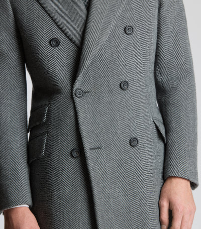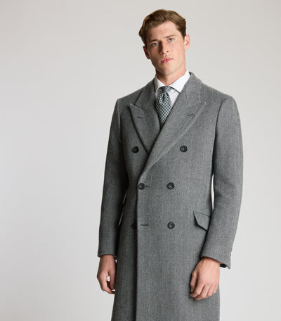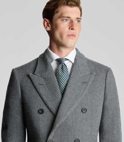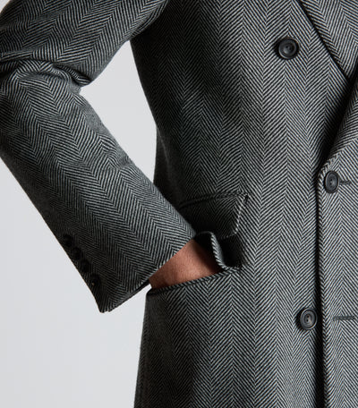 This 100% wool, classic double-breasted overcoat comes in an exclusive oversized herringbone design, with cloth by Joshua Ellis. Cut with the ‘Hammick’ wide peak lapel, a Huntsman signature style, side pockets and ticket pocket, traditional tailoring meets timeless design to create a statement overcoat for your cold-weather wardrobe.