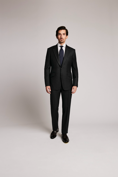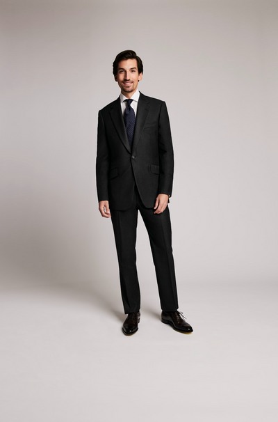 We've introduced true navy blue and charcoal grey suits in our signature one-button house cut. Made in England, this Scabal suiting cloth is a tight and dense weave, giving a wonderful matte finish with little or no lustre. Recognising the importance of adaptable workwear, these suits look as sophisticated with a tie as they do without, and are designed for versatility.