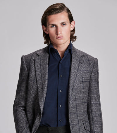 For Autumn-Winter, Huntsman has created two exclusive cashmere designs with Joshua Elis for a pair of splendid sports coats. The subtle hairline check of this cashmere is perfectly balanced in two styles, in tones of blue and navy and navy and rust. Cut in the signature Huntsman one-button style, consider this your definitive jacket for cold weather for in town or in the country.